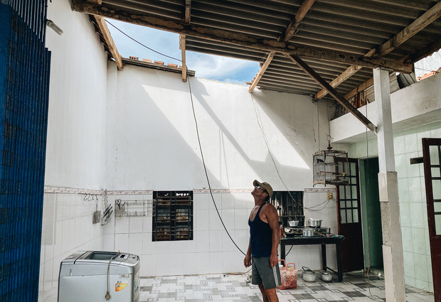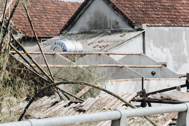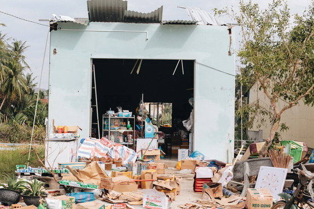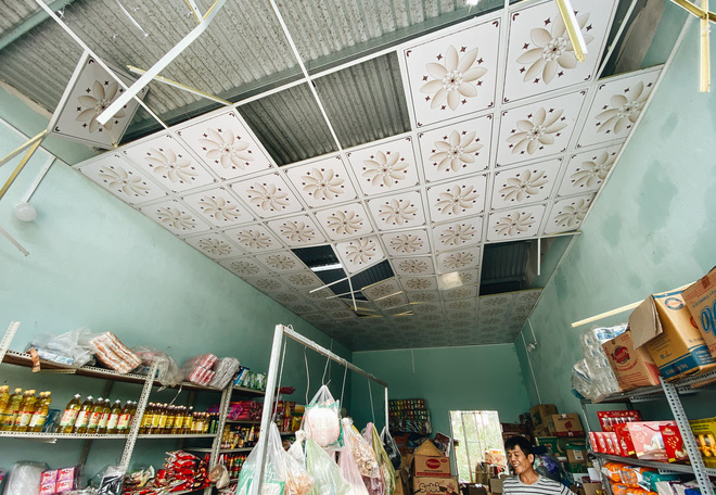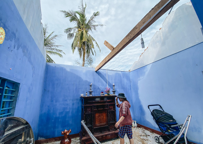 Theo chị Thảo, lúc trời mưa bão, gió rít từng cơn, vợ chồng chị ở trong nhà trông con mới gần 1 tuổi nằm trên chiếc xe đẩy thì mái tôn bật lên phát ra tiếng kêu nên cả nhà chạy vào nhà tắm để trú ẩn. Sau khi bão đi qua, trời yên gió lặng bước ra từ nhà tắm thì cả hai vợ chồng đứng thất thần muốn khóc vì 2 gian nhà trống toác, đồ đạc bị ướt sạch, mái nhà thì nằm dưới đất.