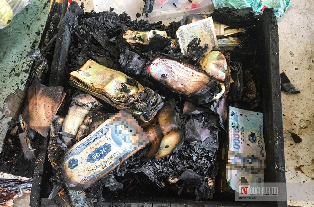 Tại hiện trường, toàn bộ căn phòng đã bị cháy rụi, nhiều cọc tiền có mệnh giá từ 500 đồng – 20.000 đồng và nhiều mảnh tiền USD Mỹ cũng được tìm thấy trong đống đổ nát.