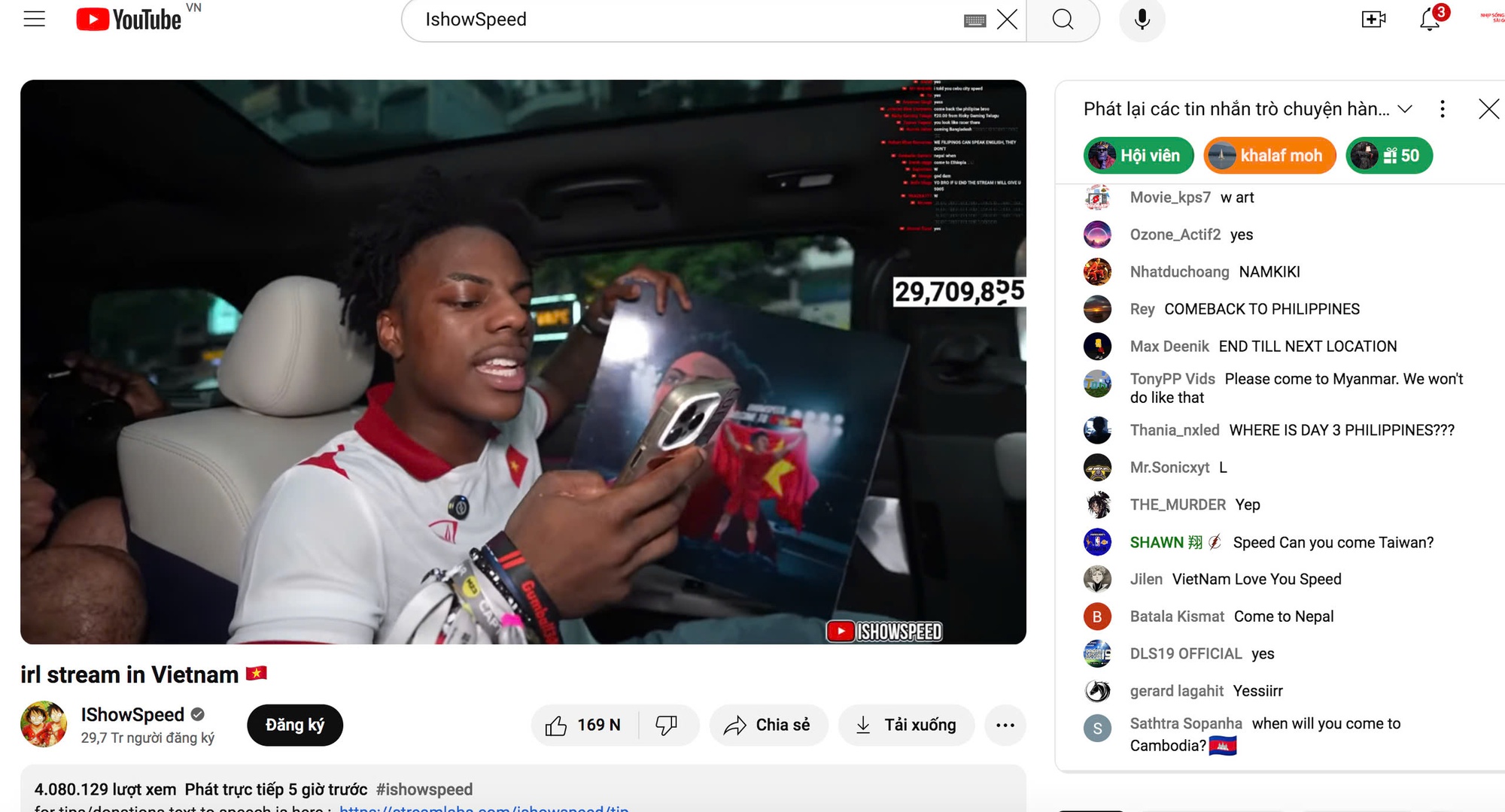 Buổi livestream trên kênh YouTube IshowSpeed đến tối 14-9 thu hút gần 4,1 triệu lượt xem với hơn 4.100 bình luận.