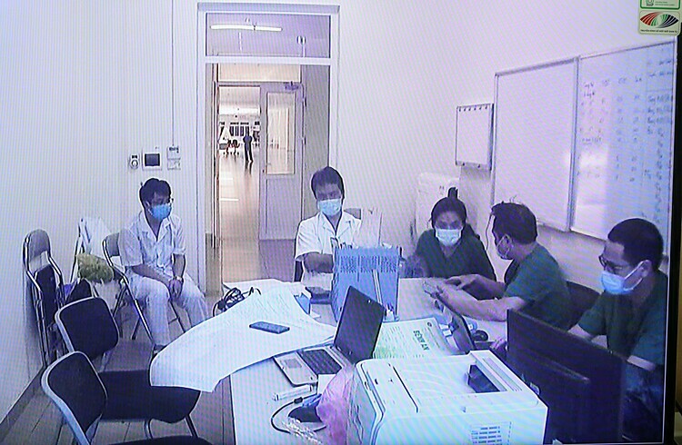 Bác sĩ Cấp cùng các đồng nghiệp họp trực tuyến với thứ trưởng Bộ Y tế Nguyễn Trường Sơn ngày 24/3. Ảnh: Ngọc Thành
