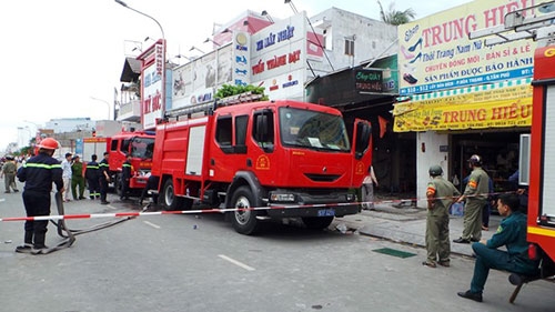 Sau đó, người phụ nữ thấy lửa trong quán hủ tiếu bốc cháy ngùn ngụt, khói cuộn bốc cao hàng chục mét kèm theo 4 tiếng nổ lớn. "Người đàn ông trong quán hủ tiếu chạy ra ngoài la hét cầu cứu vì vợ con đang mắc kẹt bên trong", bà kể.