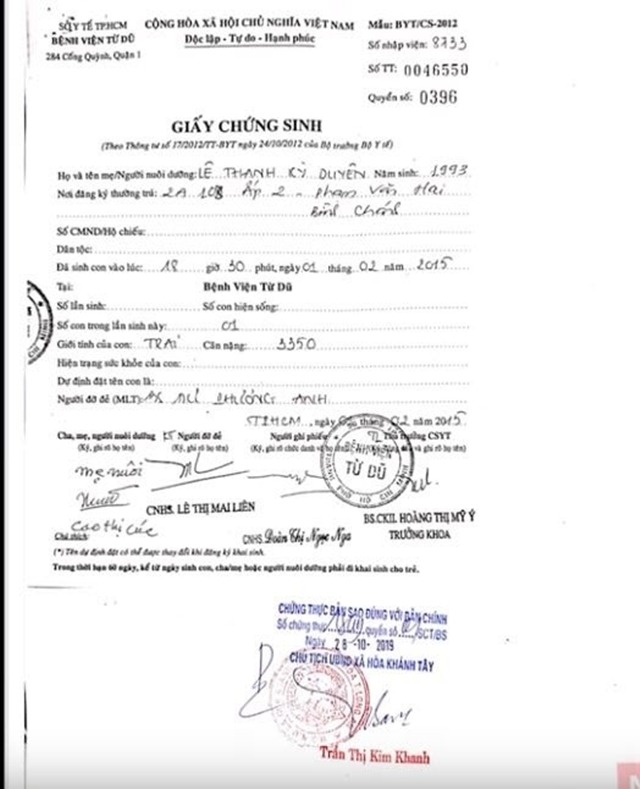 Nhưng thực tế thì sao? Trong một tờ giấy chứng sinh ở Bệnh viện Từ Dũ năm 2015 ghi tên Lê Thanh Kỳ Duyên rất rõ. Hình ảnh cô ôm một em bé mới sinh từ bệnh viện đi về cũng đã được ghi lại.