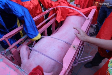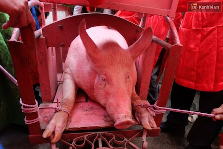 Đúng 17h chiều mùng 5 Tết sau khi làm lễ với gia chủ, phía Ban tổ chức đã đưa "ông ỉn" vào lồng sắt. |