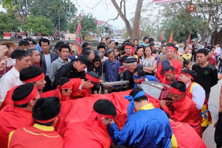 Tiếp đến 2 đoàn đi theo 2 hướng Đông và Tây nơi hai chủ nuôi "ông ỉn" để đón về đình làng. |