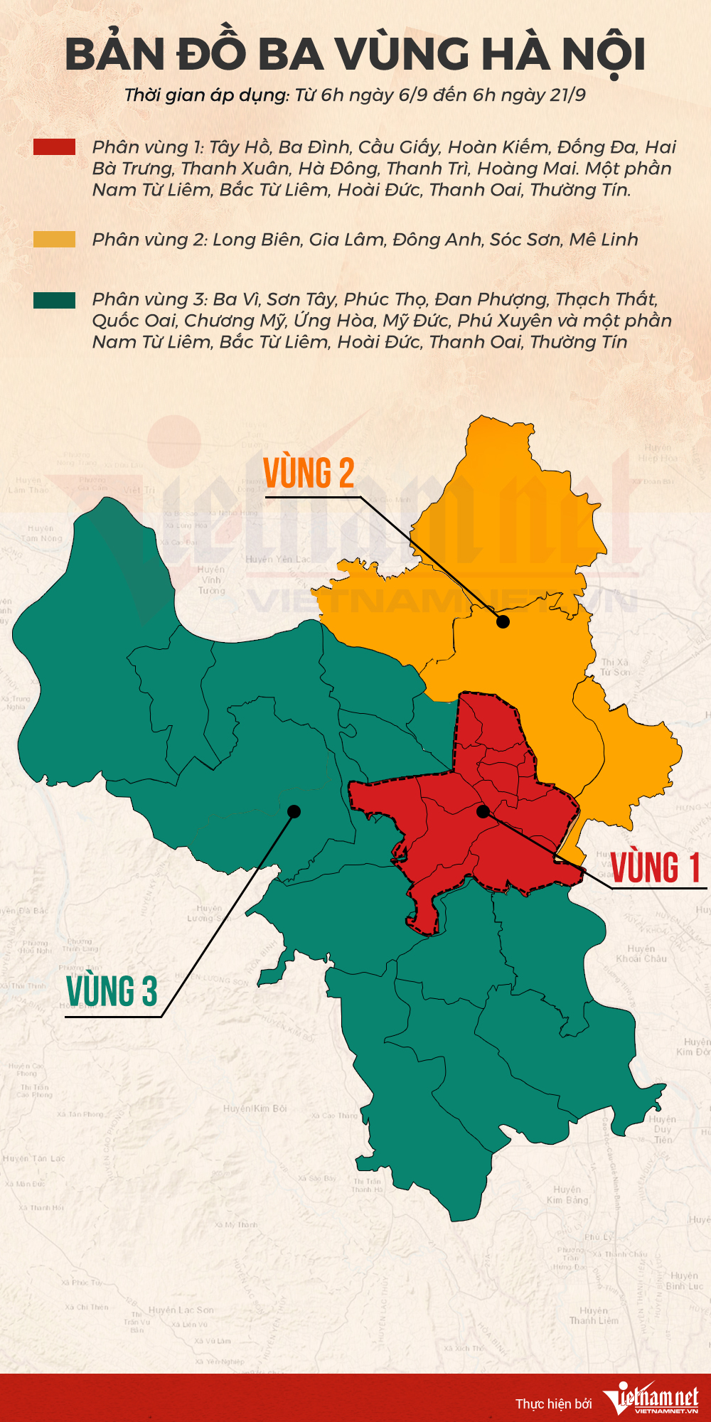 Từ 6h ngày 6/9 đến 6h ngày 21/9, Hà Nội quyết định triển khai các biện pháp phòng chống dịch tại 3 vùng. Phân vùng 1 (vùng đỏ) tiếp tục thực hiện Chỉ thị 16, vùng 2 (vùng vàng) và vùng 3 (vùng xanh) theo Chỉ thị 15 tới 6h ngày 21/9.