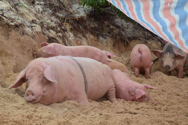 "Không biết bao giờ nước mới rút để lùa chúng về, mấy ngày nay mệt và khổ quá", bà Thủy giãi bày rồi đưa ánh mắt nhìn những con lợn đang nằm co ro trên cát vì lạnh, da thịt chúng chầy xước, nổi vết thương đỏ khắp thân.