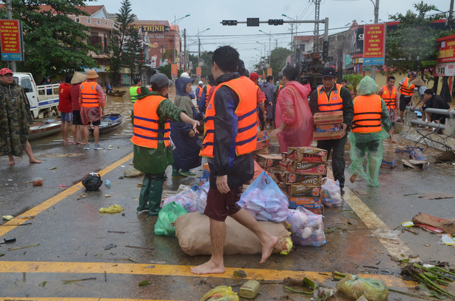 Trưa 21/10, tại ngã tư Cam Liên, huyện Lệ Thủy, hàng chục xe tải chở hàng cứu hộ của các đoàn từ thiện từ khắp nơi tấp nập dồn về ùn ứ, đứng xếp thành hàng dài. Bên mép Quốc lộ 1A, từng đoàn thanh niên trai tráng đang chạy đua nước rút đưa đồ tiếp tế vào thị trấn Kiến Giang trước khi trời tối.