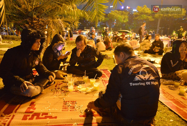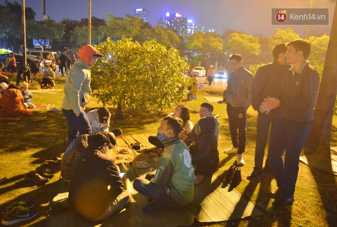 Có lẽ vì đến sớm, chờ đợi lâu nên nhiều người tranh thủ tìm quán nước, uống cốc trà nóng, nhai cái kẹo lạc, hướng dương trò chuyện... "Chớp" lấy dịp này, những người bán nước quanh khu vực cũng trải sẵn chiếu trên các bãi cỏ trước khu vực SVĐ Mỹ Đình để cho người dân ngồi uống nước.