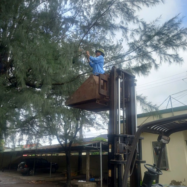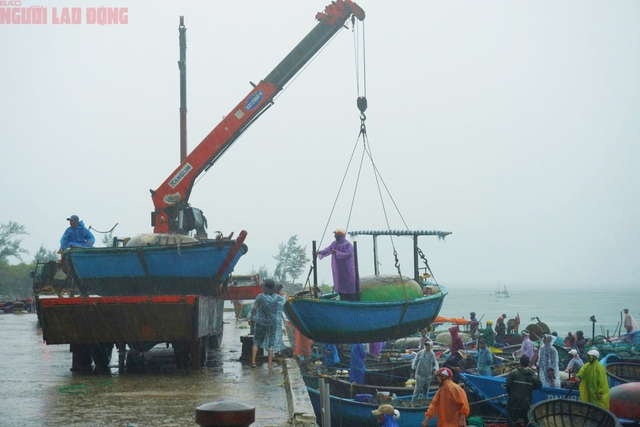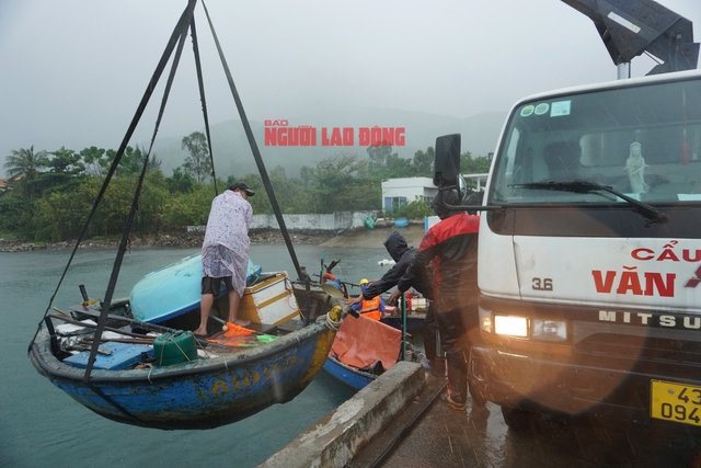 Ngư dân Phạm Văn Tuấn cho biết gia đình anh có 4 thuyền thúng, từ sáng sớm anh cùng người thân ra chân cầu cảng thuê xe cẩu thuyền lên bờ tránh bão. "Giá cẩu tùy vào thuyền lớn nhỏ, như gia đình tôi thuê cẩu mỗi chiếc là 300.000 đồng" - anh Tuấn chia sẻ.
