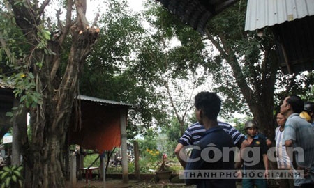 Bất ngờ, một cành cây vừa tỉa xong đổ thẳng vào dây điện cao thế, nhiễm điện, truyền thẳng vào người ông Ghía khiến ông này bị điện giật dính vào cành cây.