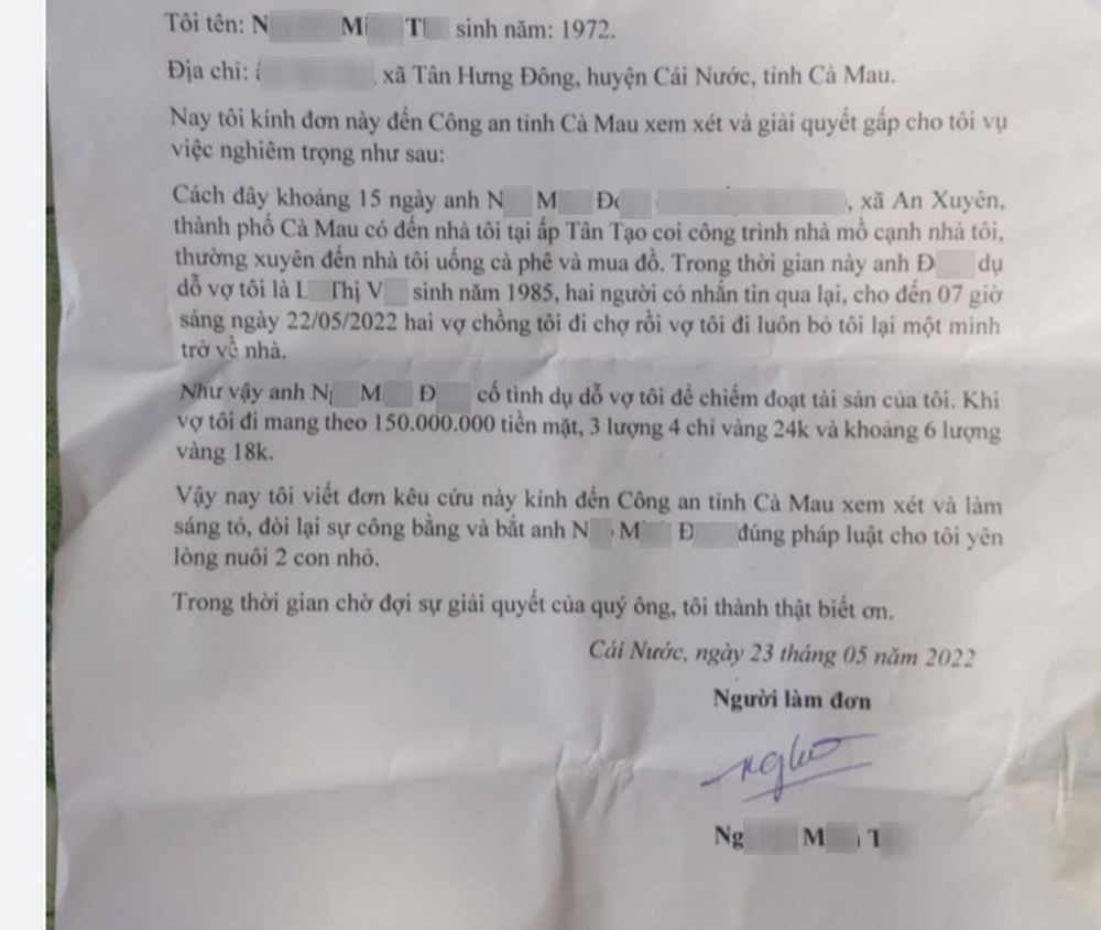 Ngày 25-5, một lãnh đạo Công an huyện Cái Nước, tỉnh Cà Mau cho biết đã tiếp nhận đơn của ông N.M.T. (SN 1972; ngụ xã Tân Hưng Đông, huyện Cái Nước) về việc "nghi vợ mang theo nhiều vàng và tiền mặt bỏ đi cùng người đàn ông lạ".