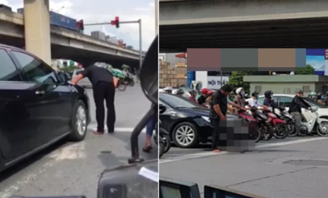 Theo hình ảnh được người đi đường ghi lại, khi mọi người đang dừng chờ đèn đỏ tại ngã tư thì một người đàn ông trung niên bất ngờ bước xuống khỏi chiếc xe ô tô màu đen rồi thản nhiên đứng "giải quyết nỗi buồn" ngay trước mặt nhiều người.