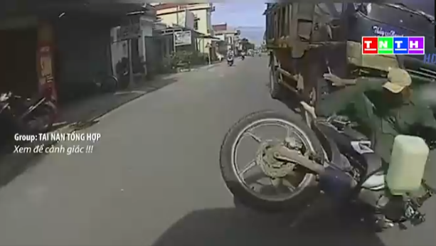 Hậu quả, người đi xe máy ngã lăn ra đường, cả thân bị bánh xe tải chèn qua nhìn cực kì ám ảnh.