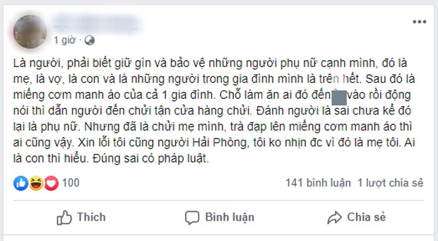 Xin lỗi tôi cũng là người Hải Phòng, tôi không nhịn được vì đó là mẹ tôi. Ai là con thì sẽ hiểu. Đúng sai có pháp luật", anh Đ. T. H. viết trên trang cá nhân.