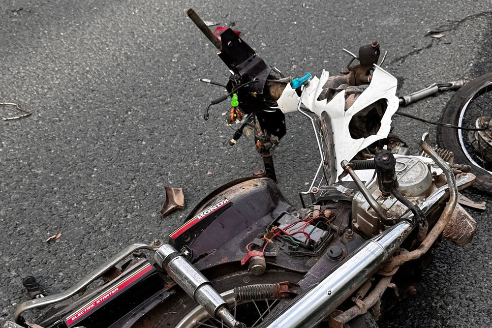 Cú va chạm mạnh khiến người đi xe máy tử vong tại chỗ, phương tiện bị biến dạng, còn ô tô bị hư hỏng nặng phần đầu xe.