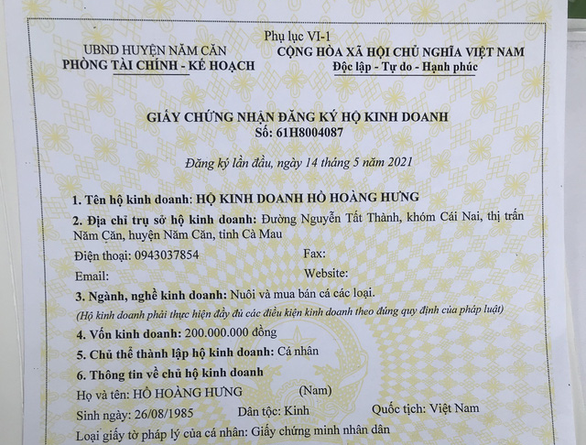 Không chỉ thế, vì nghe người ta nói "là doanh nghiệp" thì đi Anh dễ, anh Hưng đã xuống Cà Mau nhờ một người đàn ông làm hồ sơ và tháng 5-2021 được Phòng tài chính - kế hoạch huyện Năm Căn, Cà Mau cấp một giấy chứng nhận đăng ký hộ kinh doanh mang tên mình, với số vốn 200 triệu đồng. Cả chuyện này, bà Hảo cũng cho rằng con mình đã "bị người ta lừa".