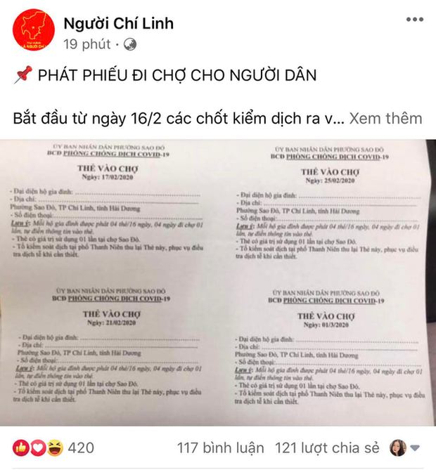 "Mỗi hộ gia đình sẽ được phát 2 phiếu/tuần, tương đương với 2 lần ra ngoài", theo thông tin từ trang thông tin Người Chí Linh đưa tin.