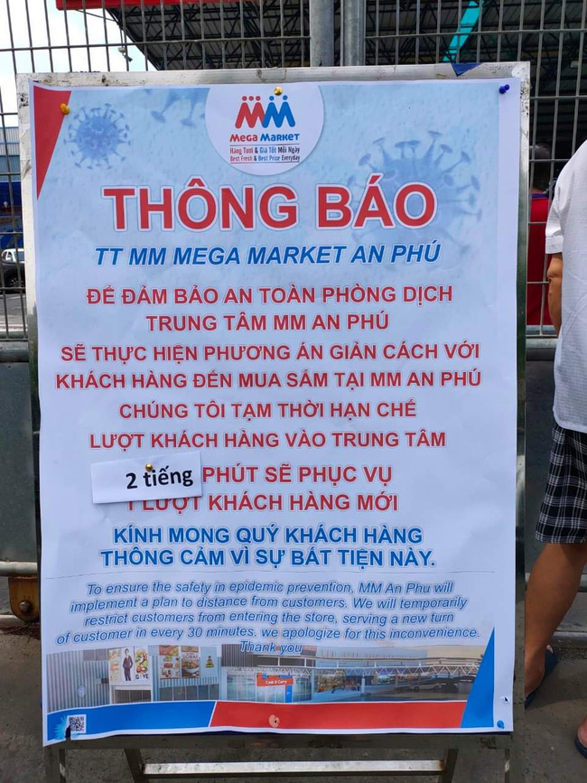 Điển hình, Mega Market An Phú (TP Thủ Đức) đã dán thông báo sẽ thực hiện giãn cách với khách hàng đến mua sắm và hạn chế lượt khách hàng vào trung tâm. Cụ thể, sau mỗi 2 tiếng nơi này mới tiếp tục đón lượt khách hàng mới.
