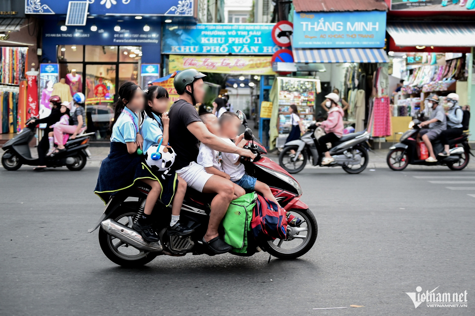 Giờ tan học, phụ huynh chở học sinh trên đường Hai Bà Trưng (quận 1) không đội mũ bảo hiểm.