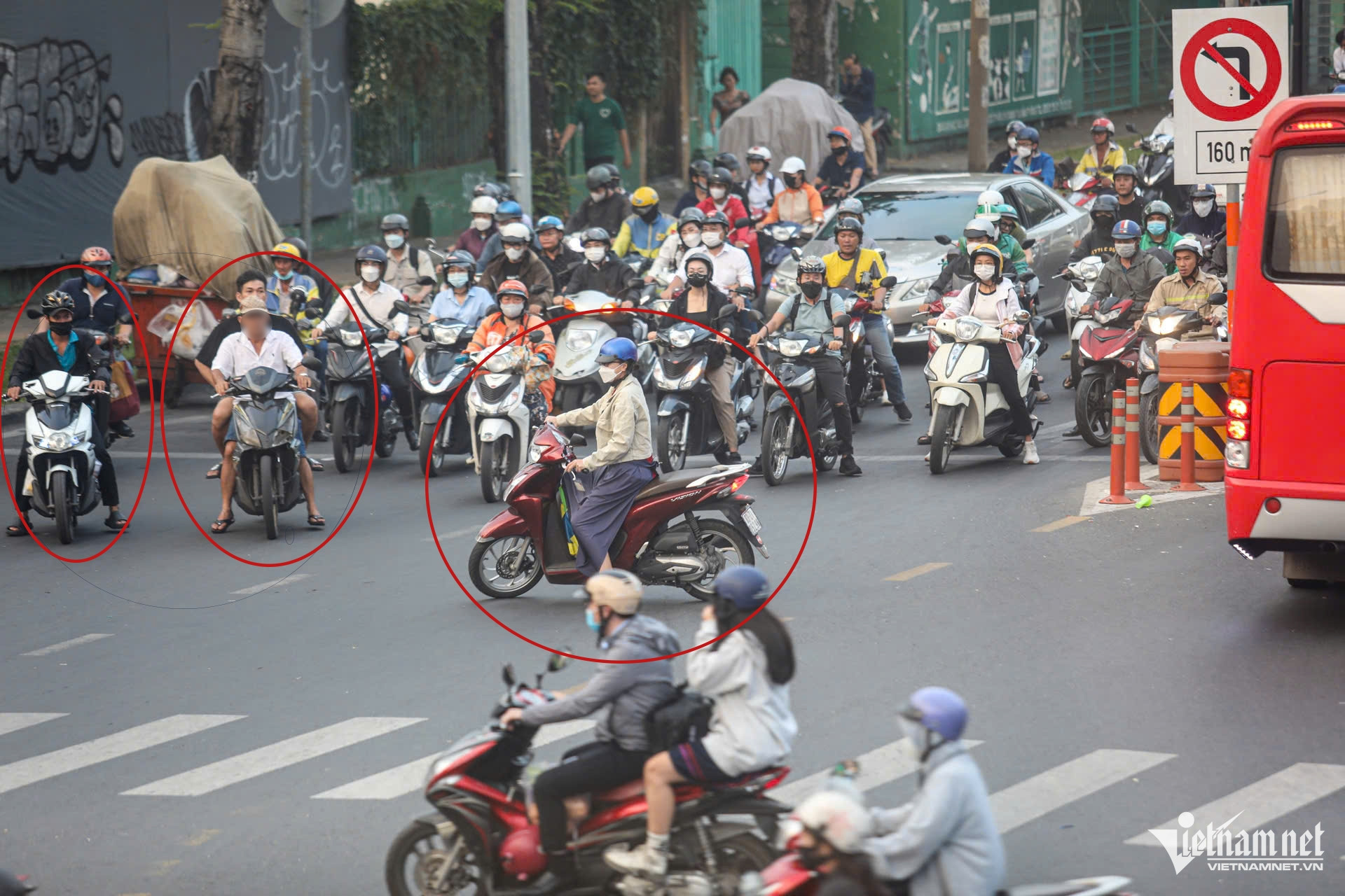 Nhiều người đi xe máy dừng chờ đèn tín hiệu ở vị trí đè vạch kẻ đường, thậm chí ở giữa ngã tư.