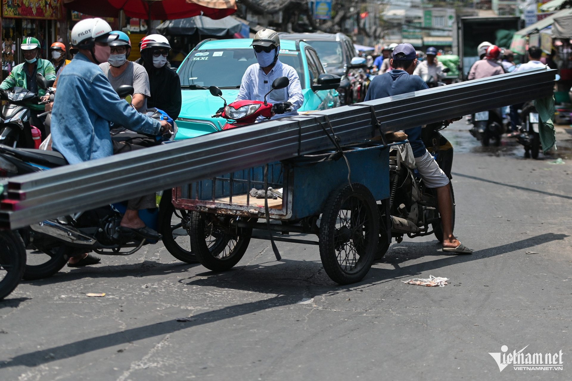 Một người điều khiển xe ba gác chở các thanh sắt quá khổ chạy trên đường Vũ Tùng (quận Bình Thạnh).