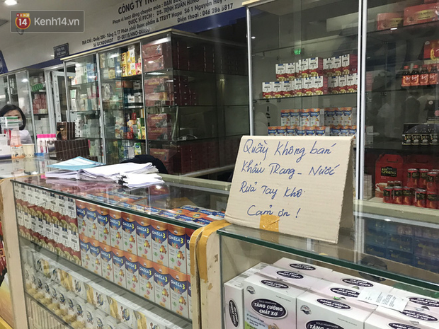 Thế nhưng đến trưa ngày 3/2, nhiều quầy thuốc ở các tầng 1,2,3 đều đồng loạt treo biển hiệu với nội dung không bán khẩu trang, nước rửa tay "xin miễn hỏi".