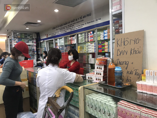 Chia sẻ với chúng tôi, chị Như Quỳnh (phường Trung Hoà, quận Cầu Giấy, Hà Nội) cho biết, chị cùng bạn đến đây mua khẩu trang vì nghĩ rằng đây là chợ thuốc lớn nhất Miền Bắc. Tuy nhiên, khi đi dọc các quầy thuốc đều thấy đồng loạt treo biển với nội dung không bán khẩu trang và nước rửa tay.