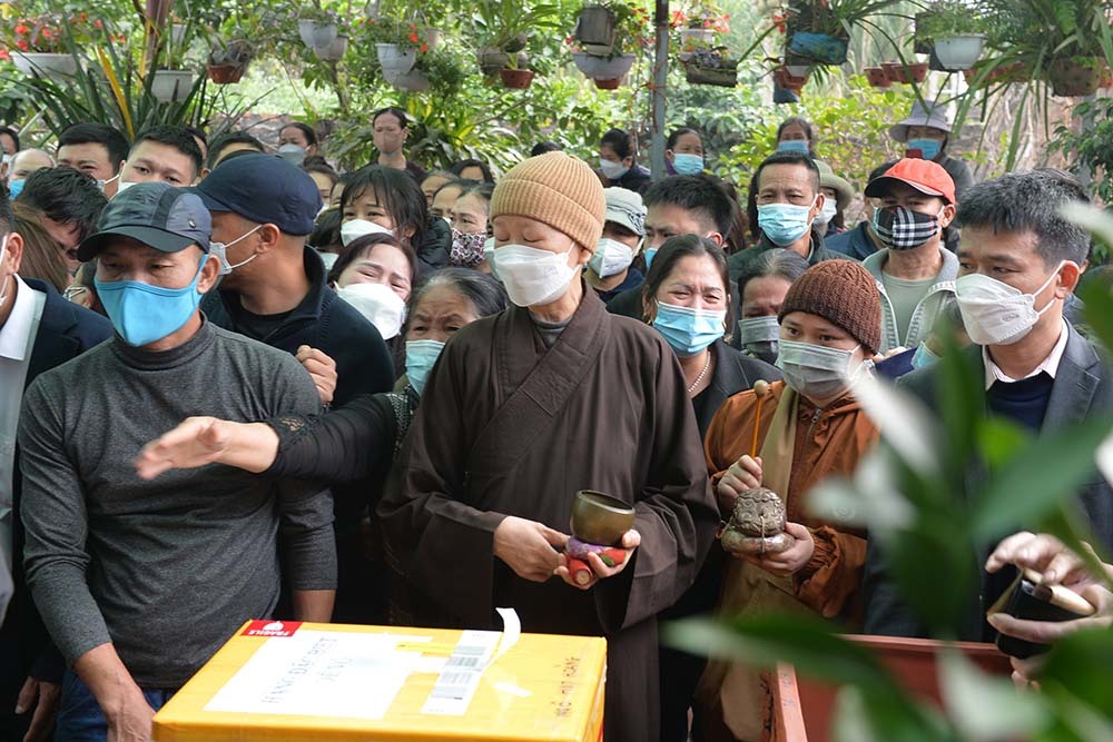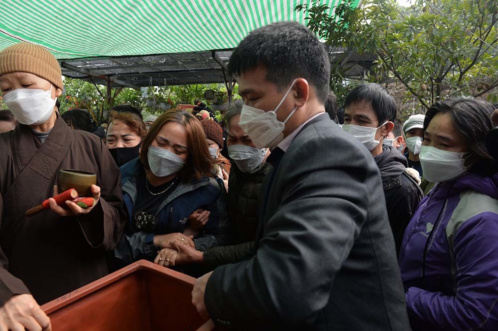 Khi nhận tro cốt 2 con, chị Nguyễn Thị Minh (mẹ 2 bé) ngã khuỵ, không thể đứng vững. Người thân dìu chị đến cạnh ban thờ hai con.