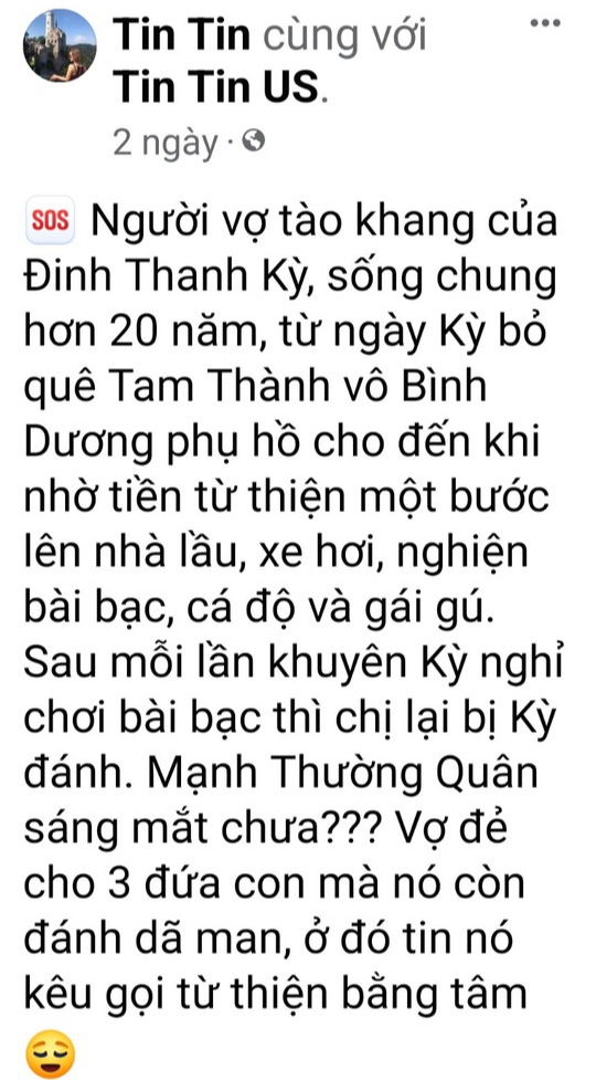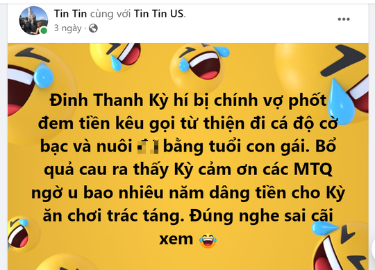 Trao đổi với chúng tôi, tài khoản Tin Tin cho biết thông tin mà cô đăng tải được lấy từ bài viết trên Facebook của người vợ vừa ly hôn với ông Kỳ. Hiện nay, nhiều người không thể xem bài viết trên trang Facebook cá nhân của vợ ông Kỳ.