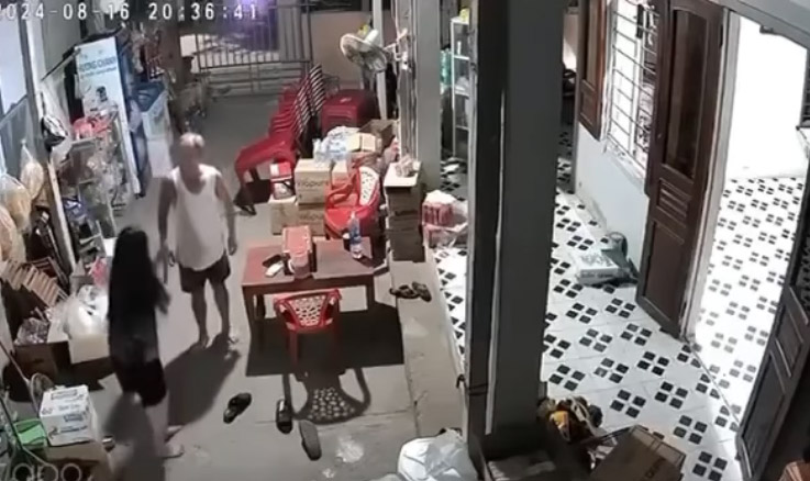 Trong đoạn clip được camera của gia đình ghi lại, ông C. tát, dùng chân đạp vào mặt bà P. Người phụ nữ tội nghiệp chỉ biết than khóc, quỳ gối chắp tay xin tha.