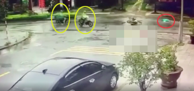 Theo nội dung đoạn clip ghi lại cho thấy, một người phụ nữ mặc áo mưa, đi xe máy đang di chuyển sang đường thì bất ngờ bị một chiếc xe máy di chuyển với tốc độ nhanh từ bên trái tông trúng.