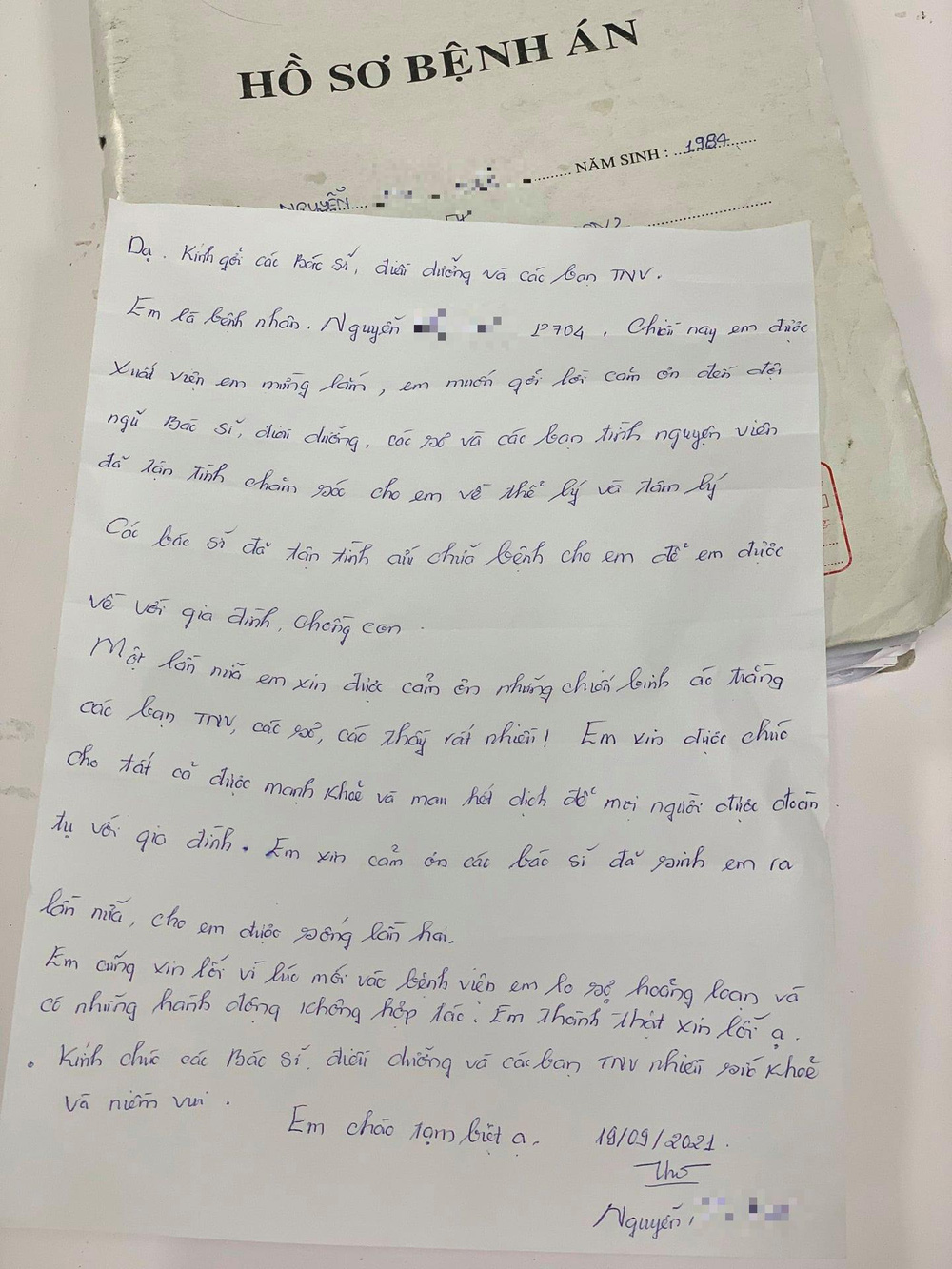 "Xin cảm ơn các bác sĩ đã sinh ra em lần nữa, cho em sống lại lần 2. Xin lỗi vì lúc vào viện em đã hoảng loạn và có những hành động không hợp tác. Em thành thật xin lỗi".