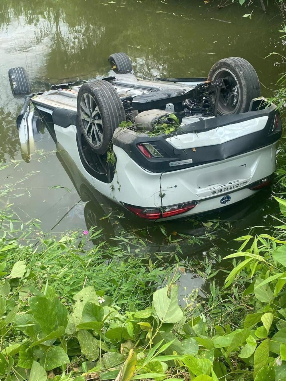 Lo lắng, người đàn ông đi tìm và phát hiện chiếc ô tô Toyota đã lật ngửa dưới ao nước gần chỗ đỗ xe ban đầu.