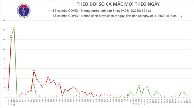 Bộ Y tế lúc 6h sáng 5/11 cho biết 12 giờ qua phát hiện thêm 1 ca mắc COVID-19, Việt Nam có 1.207 ca bệnh.