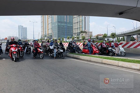 Đây là cách trốn nắng hiệu quả nhất mỗi khi đi trên đường. Người dân đều tập trung vào bóng mát chờ đèn đỏ từ khoảng 10m trên Xa lộ Hà Nội. |