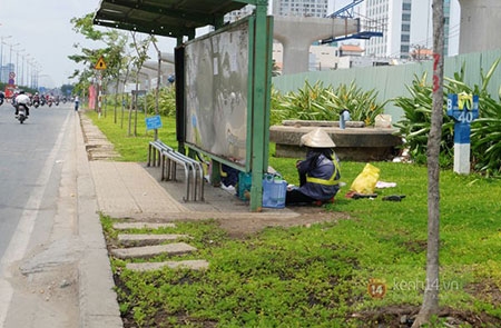 Công nhân môi trường tranh thủ nghỉ trưa tại trạm xe buýt để tránh cái nắng gay gắt. |