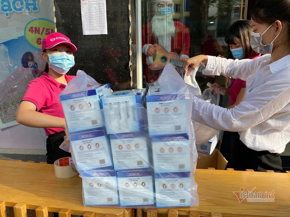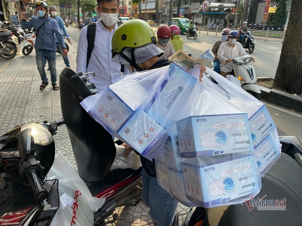 Ghi nhận tại điểm bán trên đường Trần Hưng Đạo (quận 1), rất đông người dân mua khẩu trang với giá 25.000 đồng/hộp loại 4 lớp. Trung bình một người mua ít nhất 2 - 10 hộp, thậm chí có người mua cả thùng gồm 50 hộp.