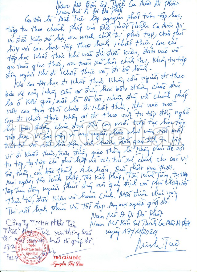 Thông báo của ông Thích Minh Tuệ có xác nhận của Công ty TNHH Phát Tâm Thiên Định Tuệ (Gia Lai, công ty có người nhà của ông tham gia), với con dấu và chữ ký của bà Nguyễn Thị Lan, Phó giám đốc công ty.