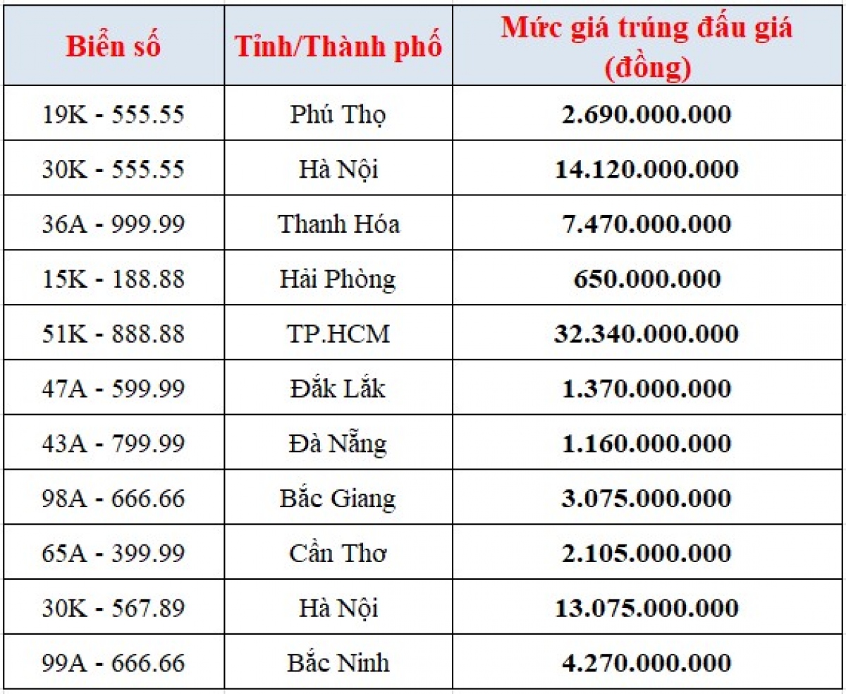 Theo đó, giá trúng đấu giá cao nhất là 32,34 tỉ đồng cho biển số 51K-888.88 (TP HCM); giá trúng đấu giá thấp nhất là 650 triệu đồng cho biển 15K-188.88 (TP Hải Phòng). Tổng số tiền trúng đấu giá là 82,325 tỉ đồng.