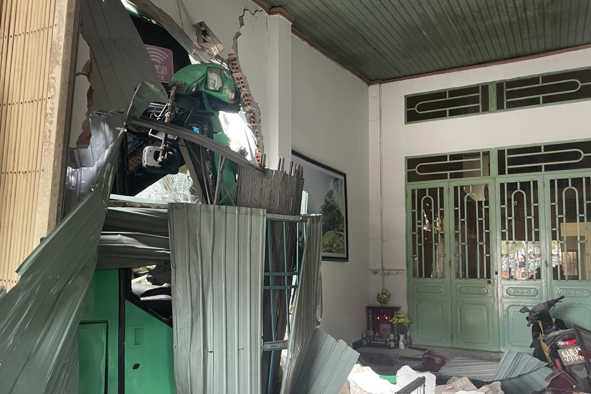 Tại hiện trường, xe khách hư hỏng nặng phần đầu, một phần tường nhà dân sập đổ.