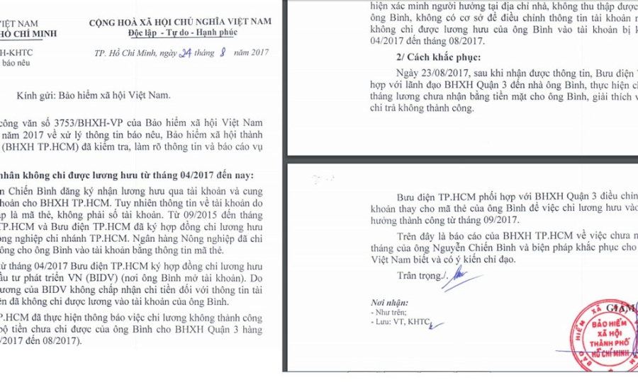 Ngày 24/8, BHXH TP.HCM đã có báo cáo gửi BHXH Việt Nam về thông tin vụ việc ông Nguyễn Chiến Bình không nhận được lương hưu từ tháng 4 đến tháng 8/2017.