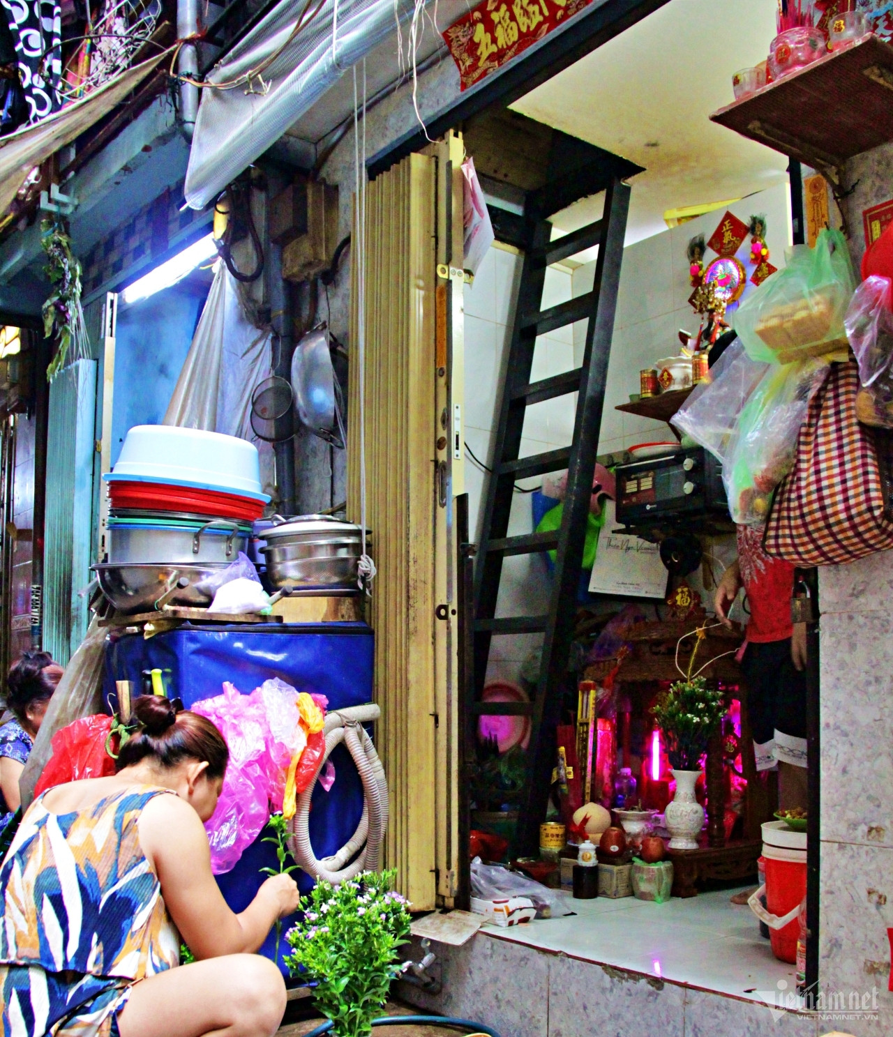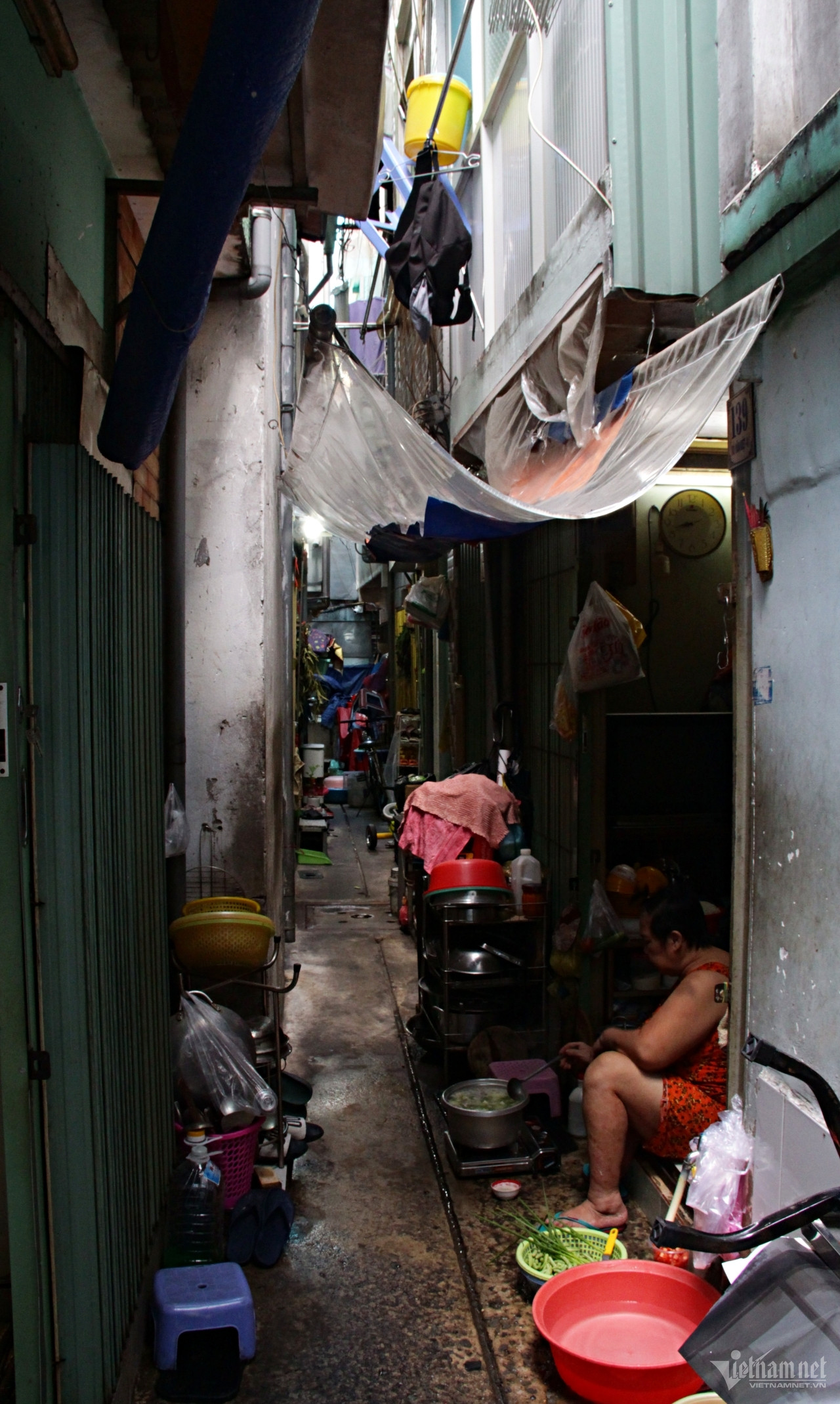 2 gia đình khác sống tại đây nhọc nhằn không kém. Vì quá chật, họ cũng tận dụng khoảng hẻm nhỏ trước cửa phòng để đặt bếp nấu ăn, làm chỗ giặt giũ...
