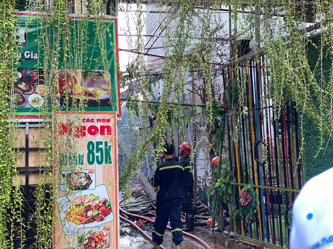 Tại hiện trường, mái che tại sân vườn của nhà hàng này bị cháy trơ khung, đổ sập. Theo một cán bộ phường, thời điểm xảy ra cháy có nhân viên đang thực hiện hàn sắt, có thể dẫn đến nguyên nhân gây cháy.