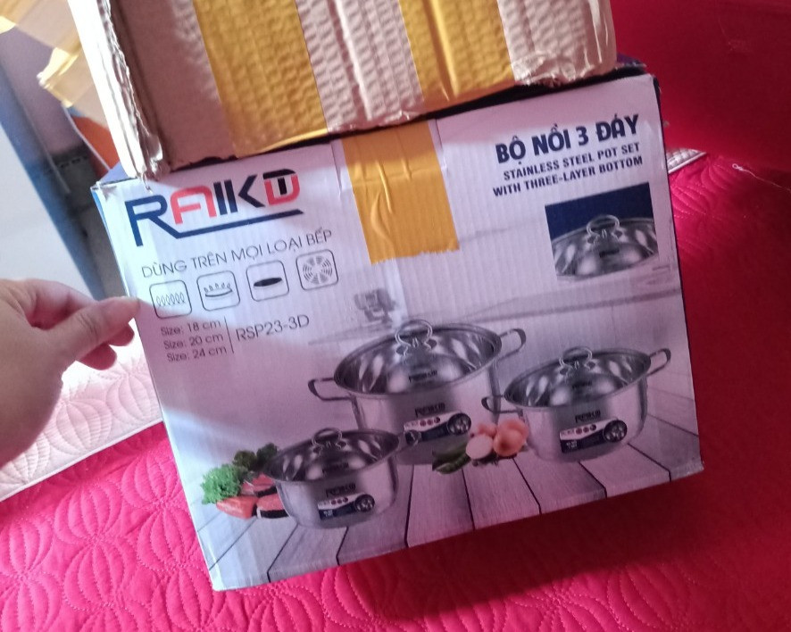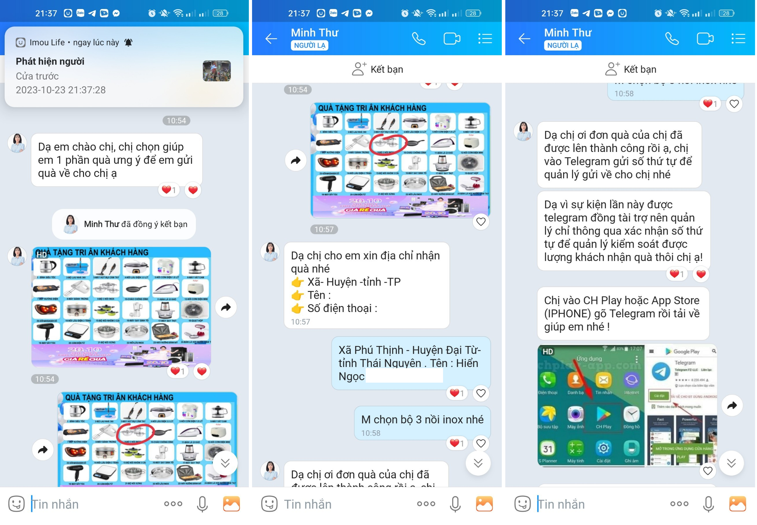 Hiển vào xem và chọn món quà là một bộ nồi inox. Cô được hướng dẫn cài đặt Telegram để lấy mã nhận quà. Ngay sáng hôm sau, 9X đã nhận được quà tặng là bộ 3 chiếc nồi, địa chỉ trên bao bì ghi nơi gửi ở Vĩnh Tường, Vĩnh Phúc.