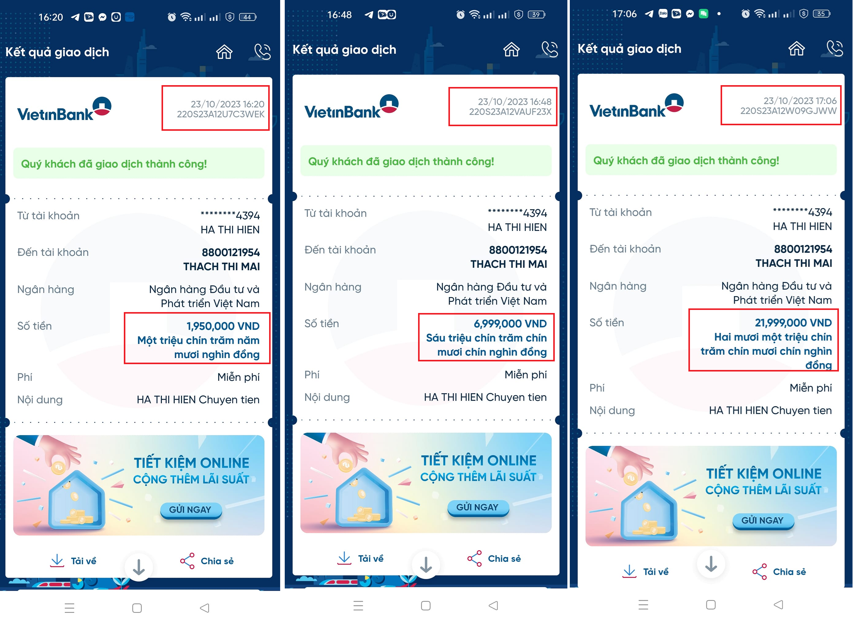 Nhiệm vụ thứ 2 với số tiền 21,999 triệu đồng, cả nhóm lại chuyển và thúc giục Hiển làm theo. “Trong tài khoản em không còn đồng nào, lại cứ nghĩ làm xong sẽ được nhận lại ngay nên em đã đi vay để chuyển tiền cho họ. Số tiền đã chuyển là hơn 30 triệu đồng”.