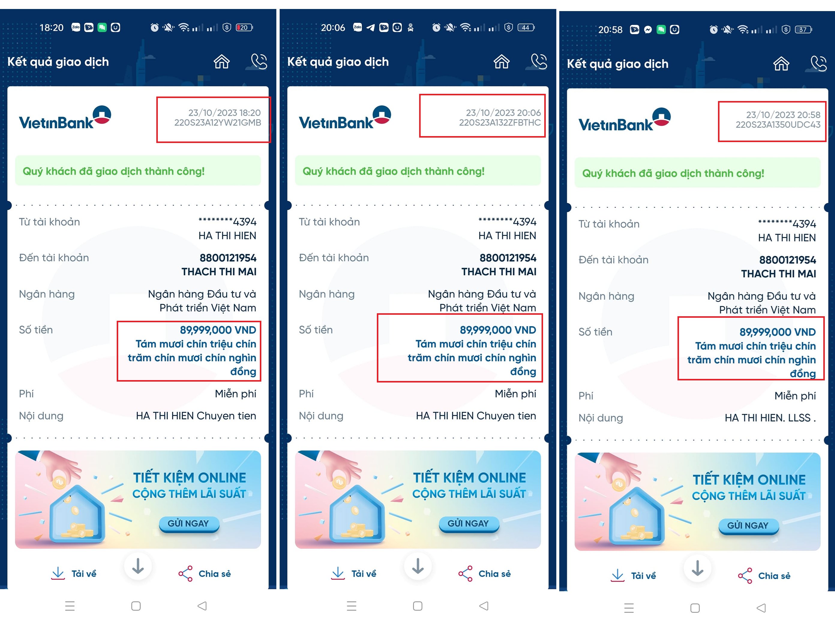 Thế nhưng, Hiển chuyển 89,999 triệu đồng lần 1, lần 2 và lần 3. Cả 3 lần Hiển đều bị mắc lỗi chuyển tiền quá thời gian quy định, sai cú pháp, hệ thống báo lỗi.