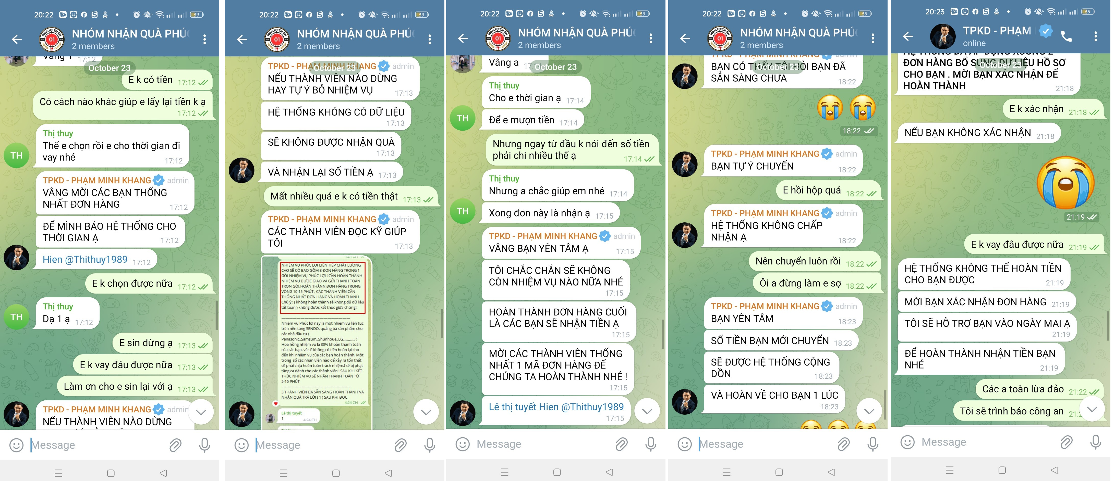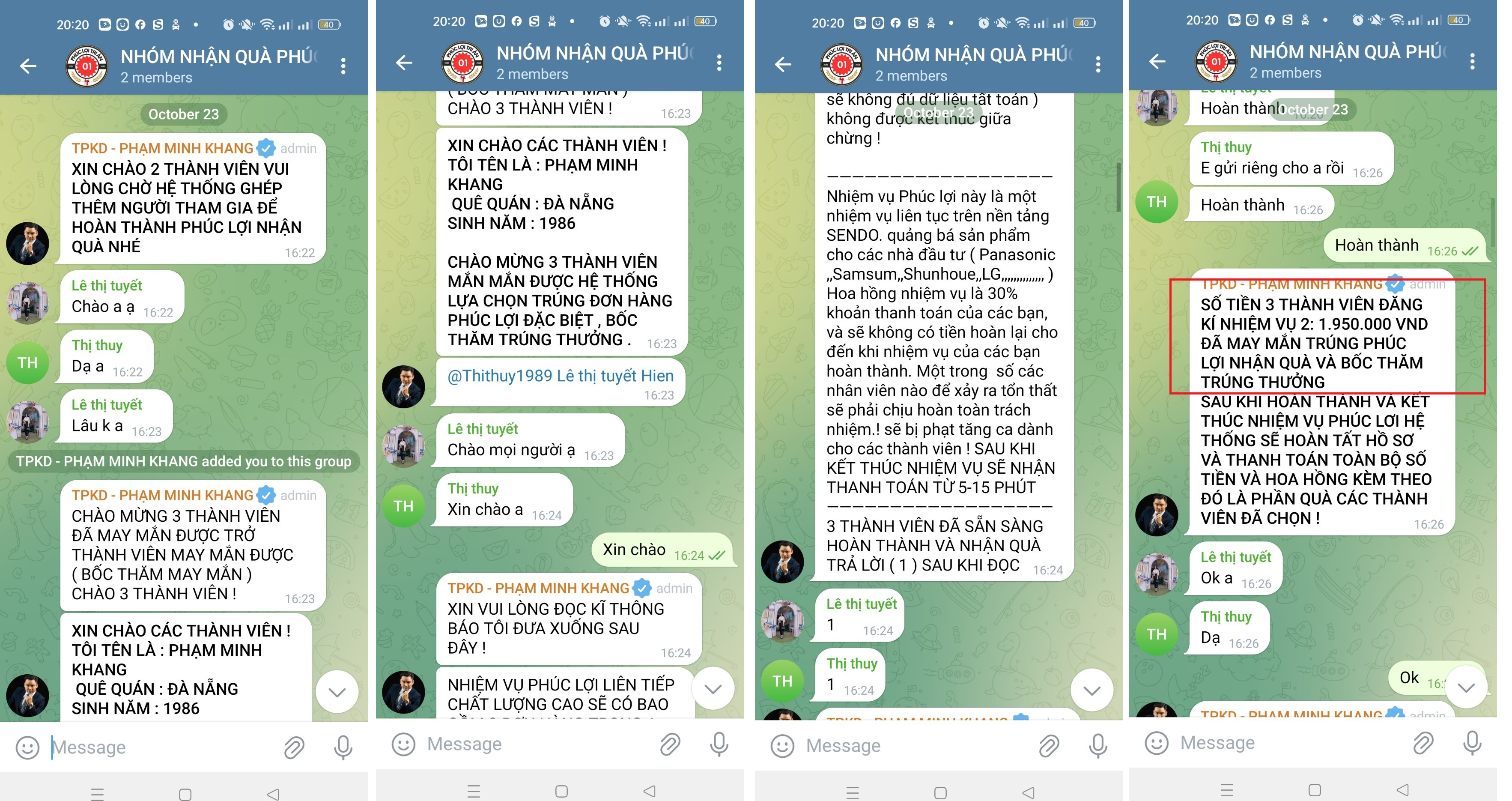 Rồi cô nghe lời dụ dỗ của mọi người, muốn nhận quà thì hãy giúp công ty hoàn thành nhiệm vụ tăng doanh số. Công ty sẽ hoàn lại vốn và lãi sau 3-5 phút. Cô thấy các thành viên trong nhóm thi nhau chuyển khoản và nhận được hoa hồng ngay sau đó nên cũng làm theo.
