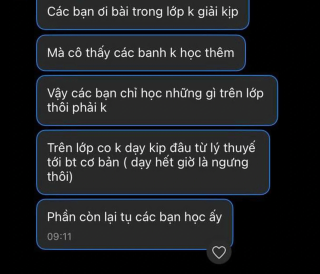 "Các bạn ơi bài trong lớp không giải kịp. Mà cô thấy các bạn không học thêm. Vậy các bạn chỉ học những gì trên lớp thôi phải không? Trên lớp cô không dạy kịp đâu từ lý thuyết tới bài tập cơ bản (dạy hết giờ là ngưng thôi). Phần còn lại tự các bạn học ấy”.