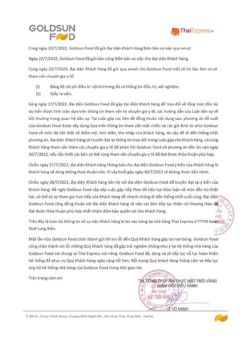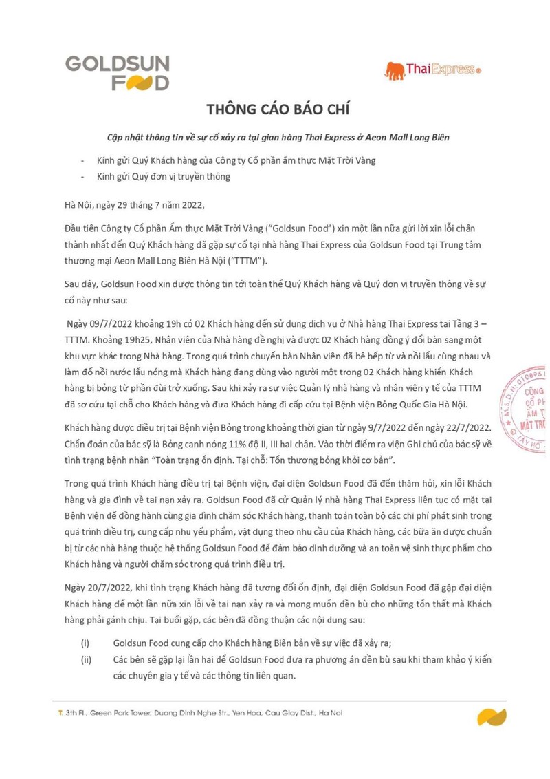 Ngày 29/7, Công ty Cổ phần Ẩm thực Mặt Trời Vàng (“Goldsun Food”) phát đi thông cáo báo chí liên quan đến sự cố tại nhà hàng Thai Express của Goldsun Food tại Trung tâm thương mại Aeon Mall Long Biên Hà Nội. Theo đó, Goldsun Food gửi lời xin lỗi đến khách hàng về sự cố này.