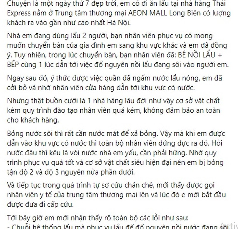 Thông cáo của Goldsun Food cho biết, ngày 09/7/2022 khoảng 19h có 02 Khách hàng đến sử dụng dịch vụ ở Nhà hàng Thai Express tại Tầng 3 –TTTM. Khoảng 19h25, Nhân viên của Nhà hàng đề nghị và được 02 Khách hàng đồng ý đổi bàn sang một khu vực khác trong Nhà hàng. Trong quá trình chuyển bàn Nhân viên đã bê bếp từ và nồi lẩu cùng nhau và làm đổ nồi nước lẩu nóng mà Khách hàng đang dùng vào người một trong 02 Khách hàng khiến Khách hàng bị bỏng từ phần đùi trở xuống.
